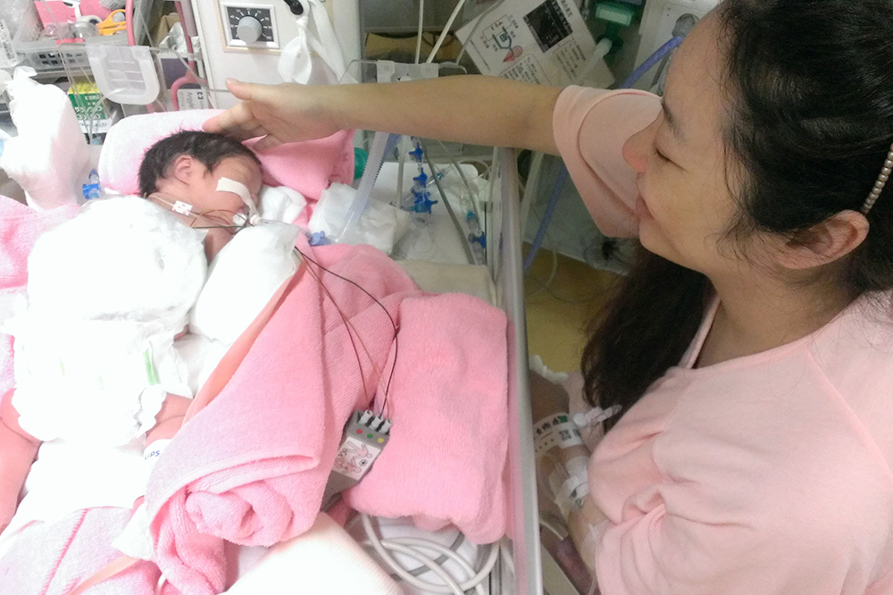 2016年4月、母子の状態を考慮して予定された帝王切開で、香織さんは紬さんを出産しました。紬さんは、すぐに新生児集中治療室(NICU)に向かいます。まだ手術台にいておなかの創を閉じる前の香織さんの手に、「看護師さんが紬の手をピッと、触らせてくれました」。そのちっちゃい手の感触を、香織さんは今も覚えています。
